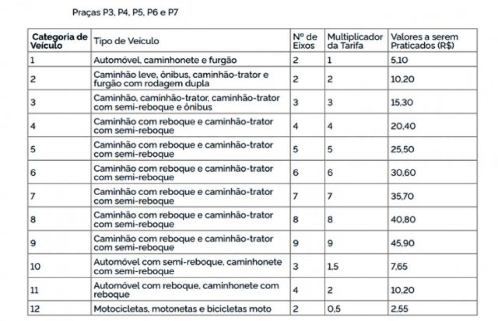 Com isso, a partir desse sábado (26), o pedágio passa de R$ 4,30 para R$ 5,10 e de R$ 2,40 para R$ 2,90, respectivamente. A deliberação foi publicada no Diário Oficial da União desta sexta-feira (25). Veja a tabela a seguir: