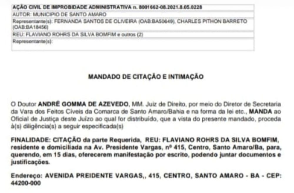 Por conta dessa ação, o ex-prefeito de Santo Amaro, Flaviano Bomfim foi citado por oficiais de Justiça no último dia 4 de julho. Segundo consta no mandado de citação, o ex-prefeito de Santo Amaro deveria ser citado no endereço avenida Presidente Vargas, 415, centro. Até esta data, o Poder Judiciário vinha enfrentando dificuldades para citar todos os réus.