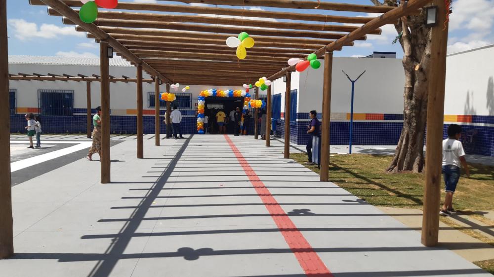 E mais: agora com a nova estrutura, os estudantes têm espaços adequados para desenvolver as atividades esportivas e culturais com a construção de um anfiteatro e da quadra poliesportiva coberta. O painel que remete a uma das obras de Monteiro Lobato, o Sítio do Picapau Amarelo foi preservado na reforma. Ainda foi instalado um pergolado.